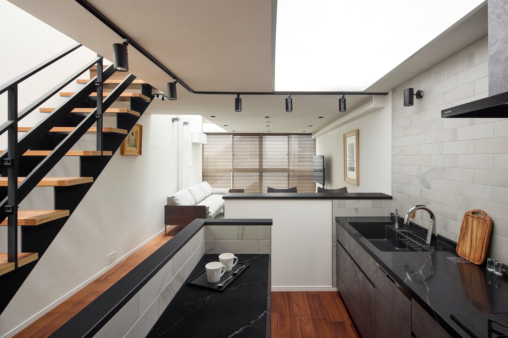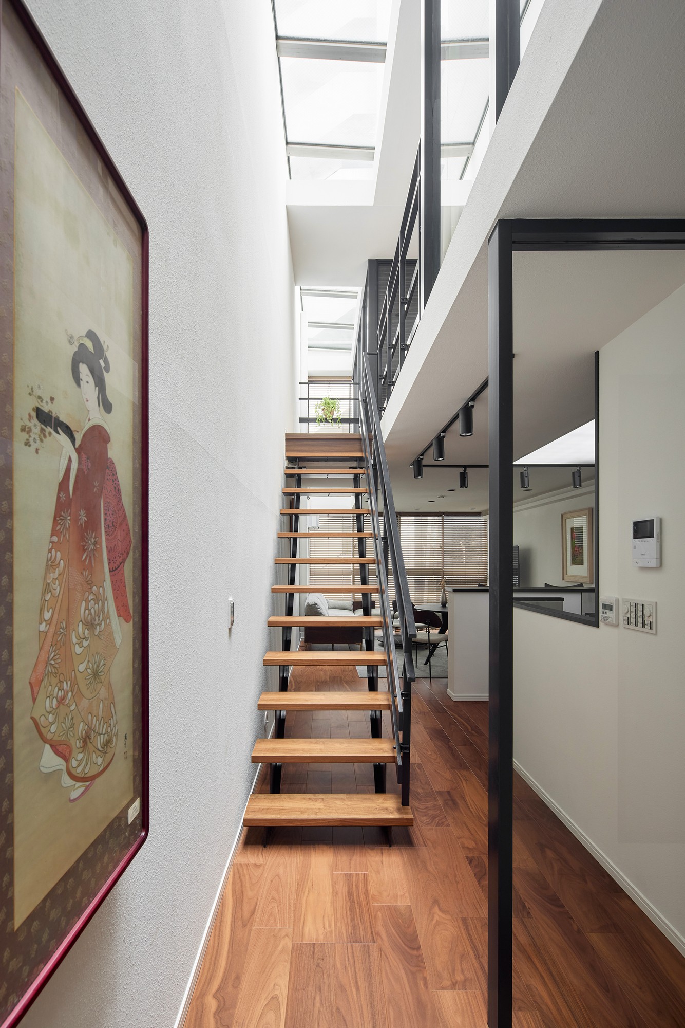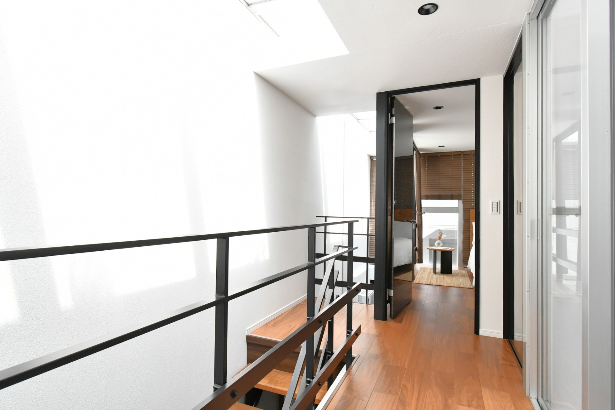 木の床、フローティング階段、そして清潔感のある白い壁が、落ち着きのあるモダンな雰囲気を醸し出し、ゆっくりとした暮らしを演出します。